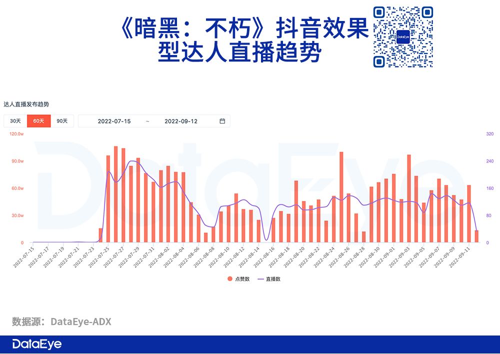 与达人视频营销浅尝辄止不同的是:在效果型达人营销方面,《暗黑:不朽》始终保持一定量的投入。DataEye-ADX数据显示:7月23号以来,《暗黑:不朽》就持续推进达人直播。近30天,抖音达人直播次数维持每天50-150场,力度中等、持续坚持,但波动较大。按照直播场次算《暗黑:不朽》位列抖音达人直播榜第30位,按最高在线人数算则排到47位。