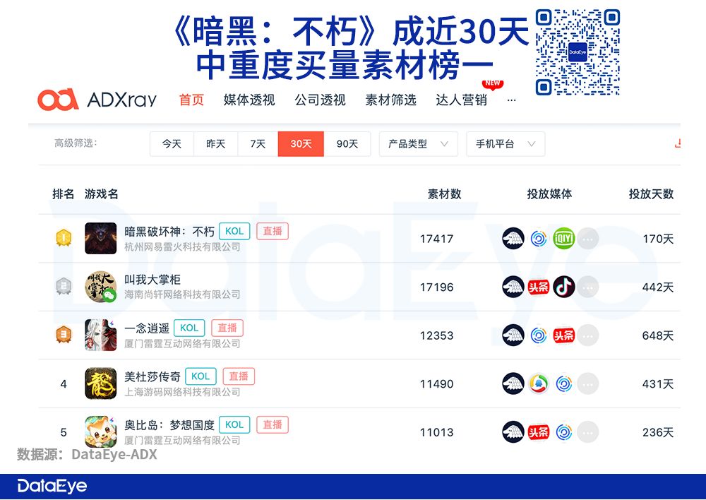 中秋节前后,《暗黑:不朽》在产品运营、市场营销方面都推出了一系列大动作,拿下近30天中重度游戏买量素材榜第一。