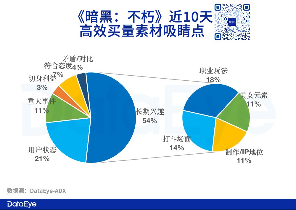 总体来看,《暗黑:不朽》有几大特点:1、品质总体能维持高水平。2、没有陷入传统主打IP情怀的思路,相比上线时不再特别突出IP。3、有独特的“暗黑”风格,不过分炫技能特效,与“花里胡哨”的同类素材形成差异化。4、创意内容、形式较多元,没有统一固定套路,有较强的尝试性。