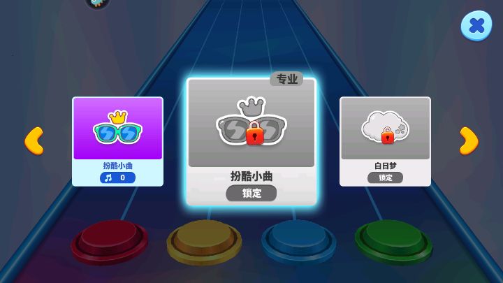 比较有意思的是电吉他大挑战,点击进入游戏后,我们需要演奏一首曲子,一共有四个按键需要我们操作,当我们弹到颤音的时候则需要长按某个键去完成。随着我们演奏完成度越高,就能不断解锁后面新的曲库,感兴趣的小伙伴快来体验一下电吉他的乐趣吧!