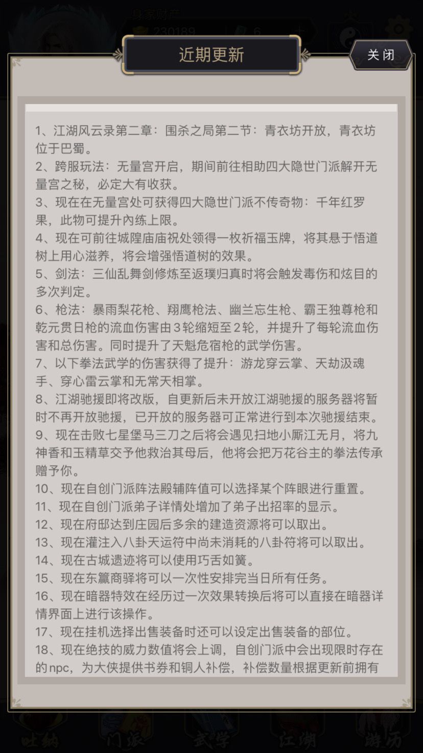 所有绝技集体伤害上调,在自创门派里会有一个限时的npc可以跟据以前创造的绝技获得补偿。记得及时领取。