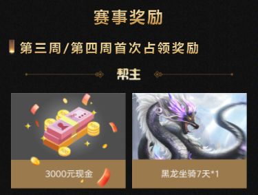 本周六城战结束后,首场青龙城霸主帮会将会产生帮主将获得3000元现金奖励和独家专属黑龙坐骑~
