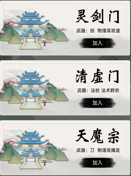 目前我玩的是清虚门,法师群伤可观,听群里大佬说 天魔宗后期比较厉害,暴力输出,不过游戏可以背叛门派重新选择其他门派,前期选择清虚就可以,这点游戏还是比较人性化。