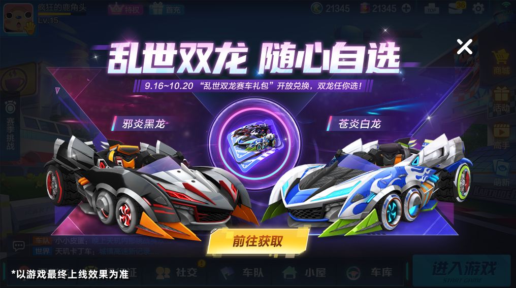 活动中心将于9月16日-10月20日开启【乱世双龙】限时兑换活动!已拥有邪炎黑龙&苍炎白龙其中之一的车友们在活动期间内可通过两种方式任选其一获取另一辆未拥有的赛车!