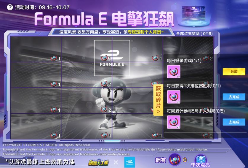 9月16日-10月7日,福利站将开启【Formula E】电擎狂飙活动。完成指定任务可获取FE方向盘,使用方向盘点亮拼图,可解锁单次点亮宝箱,拆开可随机获得奖励,点亮拼图中的所有格子,即可领取Formula E联名专属个人背景!