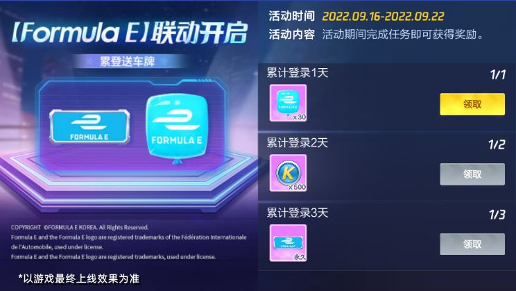 9月16日-9月22日,活动中心将开启【Formula E】登录送车牌活动。活动期间车友们累计登录天数达到任务要求,即可领取Formula E气球*30、酷币*500、永久Formula E车牌。