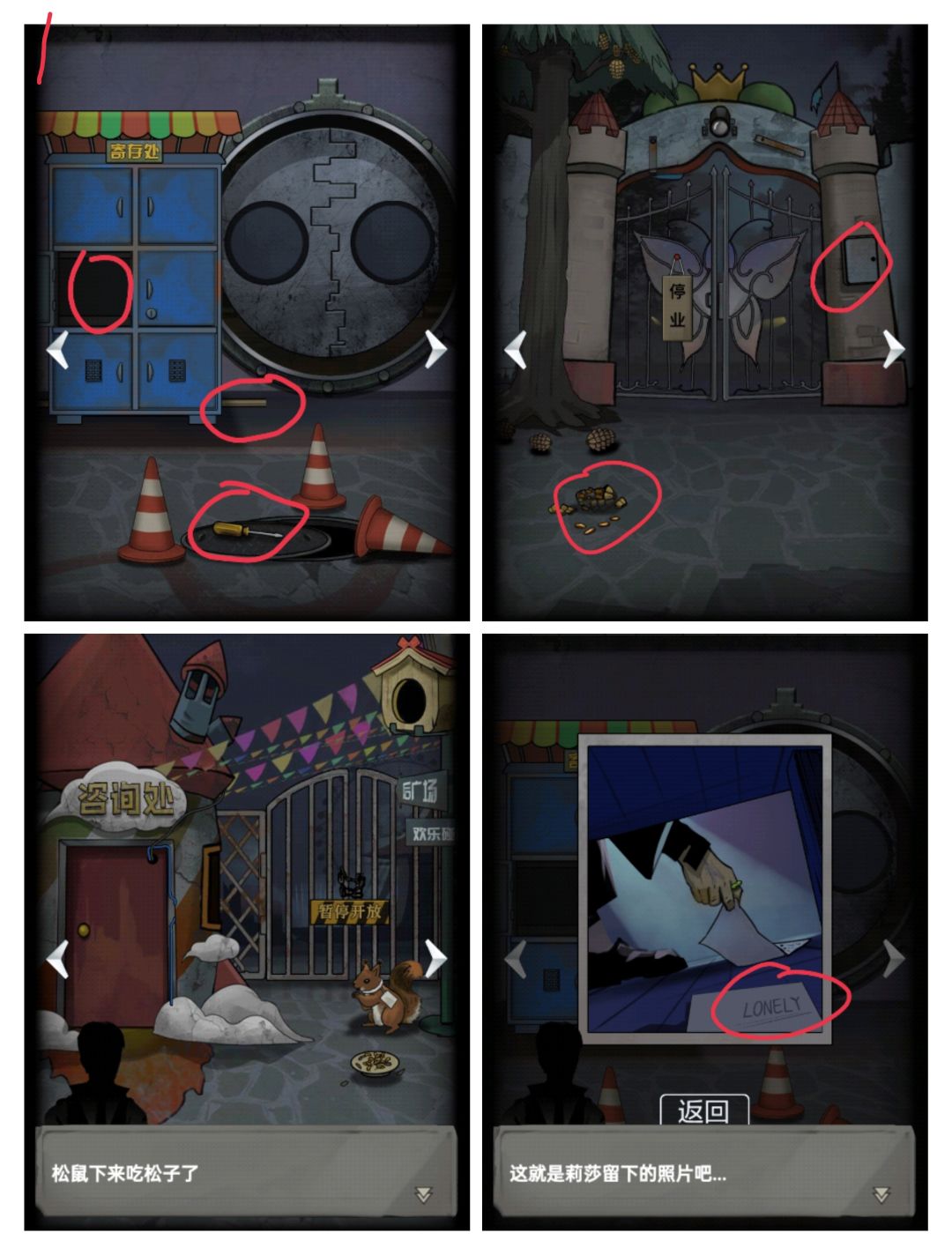 ①走完新手指引后,拿钥匙开寄存处得到锤子,地上捡到棍子和螺丝刀。回到大铁门,左边用棍子和锤子得到松子,右边用螺丝刀开铁箱。咨询处旁边碗里放入松子,得到钥匙,钥匙开寄存处得到操控杆和LONELY的线索。