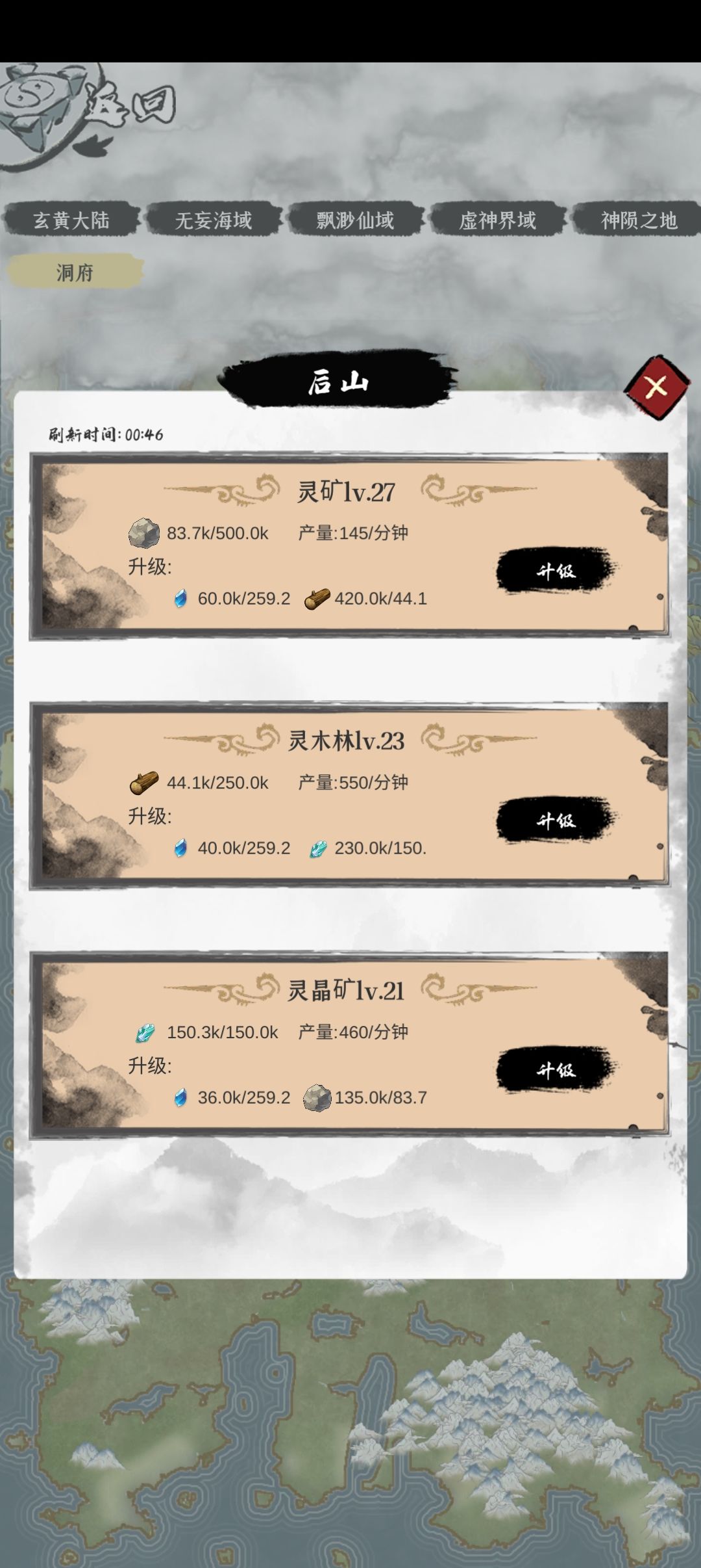 后山初期就可以接触到,建议尽快升级,提高资源产量,后山是资源的唯一产地,越往后资源是越不够用的,因为要供给其他的项目,灵矿的等级一定要比其他两个高,因为灵矿的产量同等级太低了,无法满足后续其他资源的升级需要