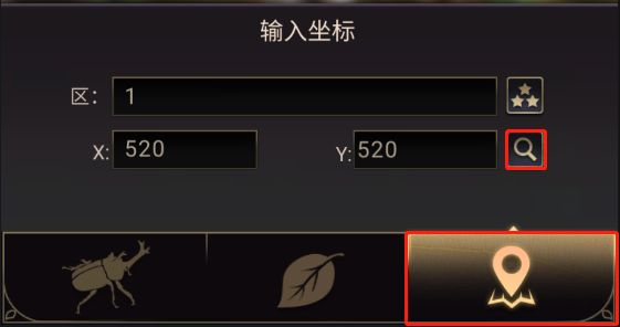 选择第三个小图标(坐标类),输入区域及对应的XY值,点击[搜索图标]即可快速定位到目标坐标。