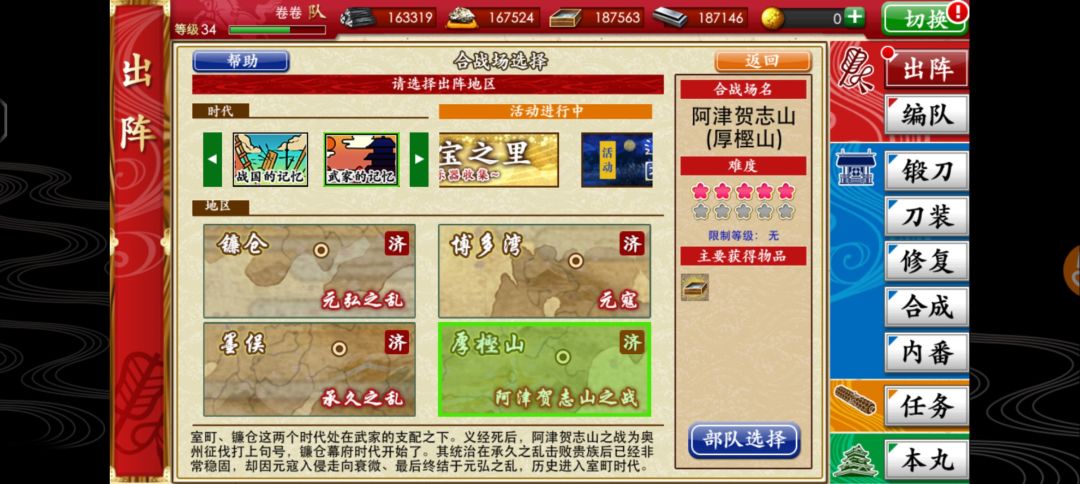 本人是回坑的老婶,建了个新号。吸取了因为之前锻刀挺欧,然后全练的太刀,结果卡六图过不去的教训,开局就练的短刀。正好赶上秘宝之里和夜晚的山村活动,短刀等级练得挺高。 打到五图就是基本70+的状态。