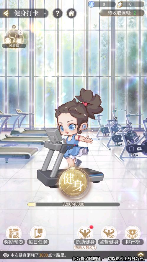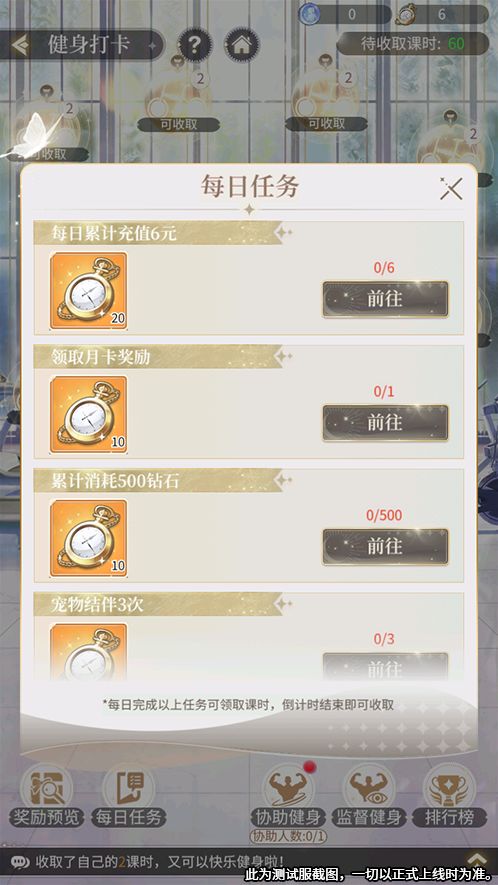每日任务:三小姐完成健身打卡中的每日任务,可自动获得课时并进入倒计时,倒计时结束后可收取课时;倒计时结束但课时未被收取时有被拾取的风险,请三小姐及时收取。