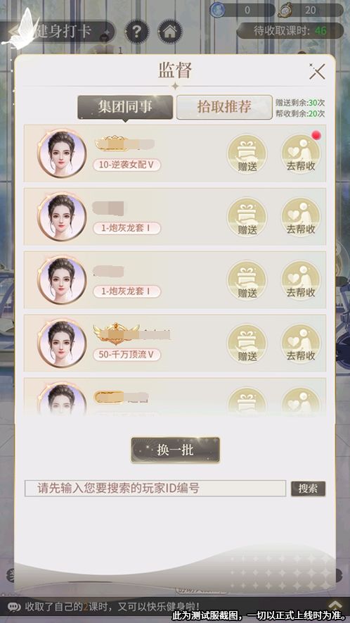 监督健身:三小姐每天可去集团同事的健身房监督她们健身,帮助收取健身课时同时也可获得集团币奖励;去非集团同事的健身房监督她们健身,可拾取她们未及时领取的课时。