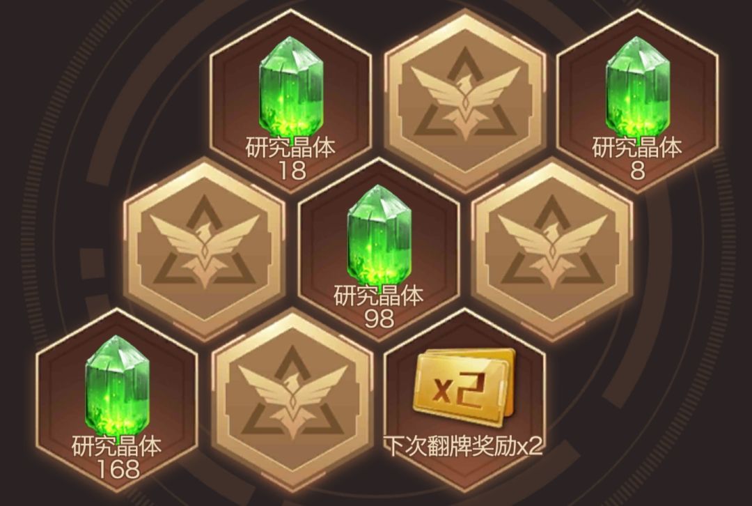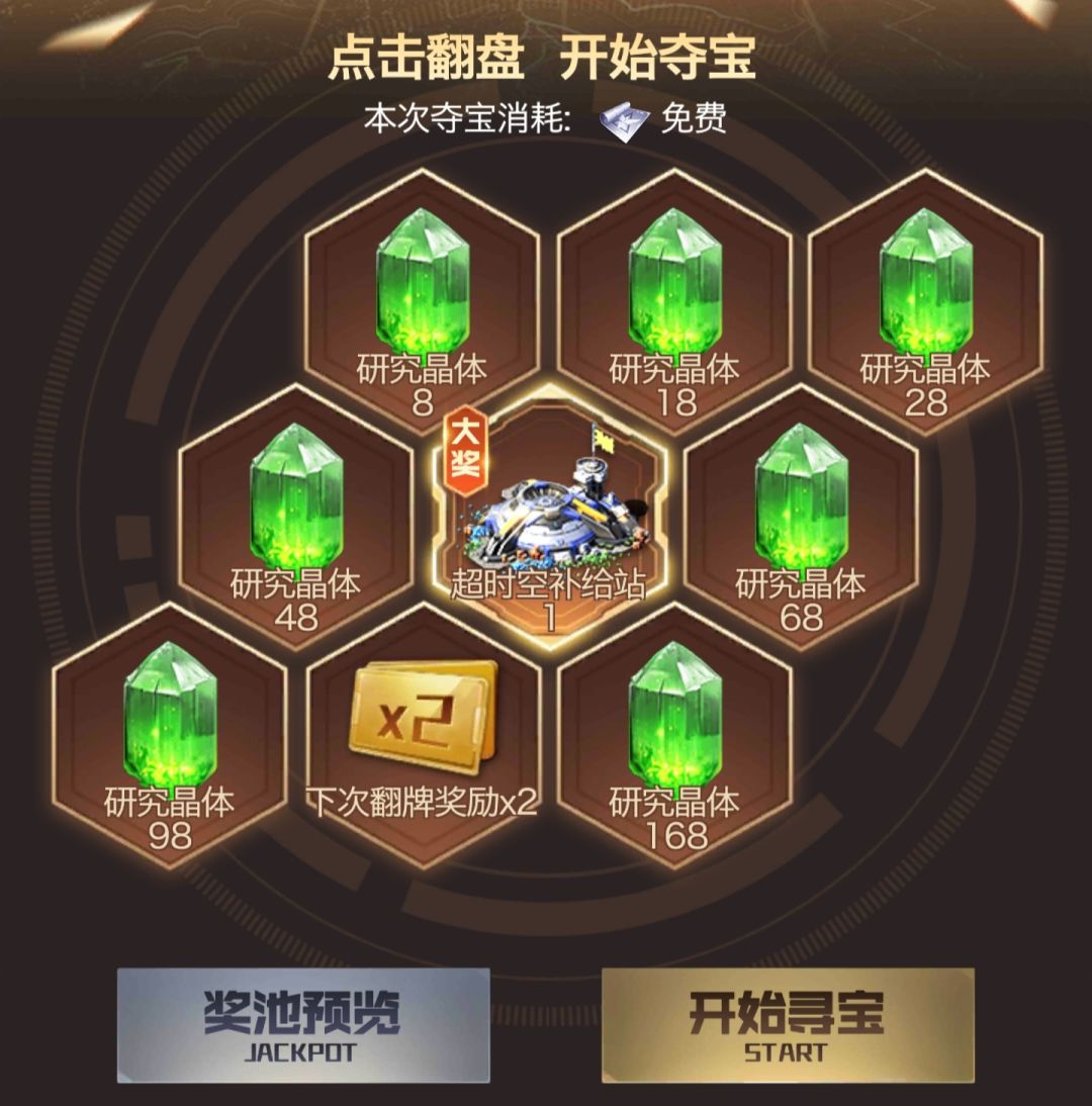 奖池的选择因人而异,根据自己情况刷新,这里建议优先选择研究晶体类,其次勋章类,再次能量源和加速类,英雄升级类如果刷到了,点一下免费的翻牌次数就刷新奖池刷新掉即可,当前基本都不缺英雄升级类的道具。二、选好奖池后就开始点击翻牌夺宝了,这里以研究晶体为例,其他奖池同理。我的翻牌方法是先点四个边缘再往里点,边缘经常能点到翻倍奖励x2。如果初次点到了98研究晶体和168研究晶体这种较高的奖励,最多再点一到两次就不要继续点了,刷新奖池准备点下一个奖池,因为较高的奖励已经拿到了剩余奖励哪怕是翻牌奖励x2性价比也不高了。如果初始点到的是8研究晶体或者18研究晶体这种较低奖励,可以继续翻四次,翻到98研究晶体或者168研究晶体就停,然后刷新奖池进行下一轮。如果翻了四次没翻到98研究晶体或者168研究晶体,不要上头,也刷新掉奖池,第五次翻牌需要3个夺宝券即消耗168金币,再继续点已经不划算了。