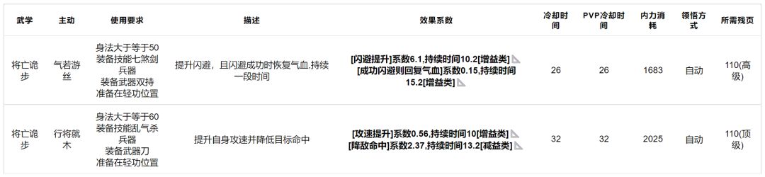将亡诡步:效果如下,技能不错,但绑定离谱,不过对比门派内其他武学,还是不错的,门派内武学主动提升优先级一般。