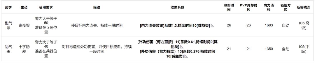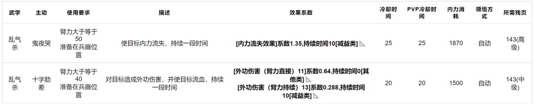 乱气杀:拥有打内技能,但系数太差,本身平砍也不强,很难上场,中→高级武学。
