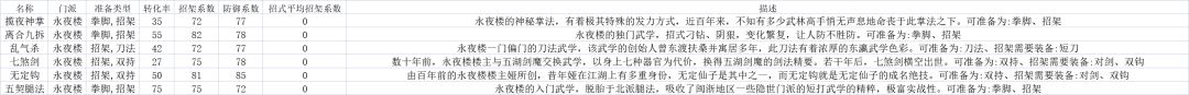 输出:武学数量较少,数量质量上均偏向拳脚武学,在兵器方面,双持勉强可用。