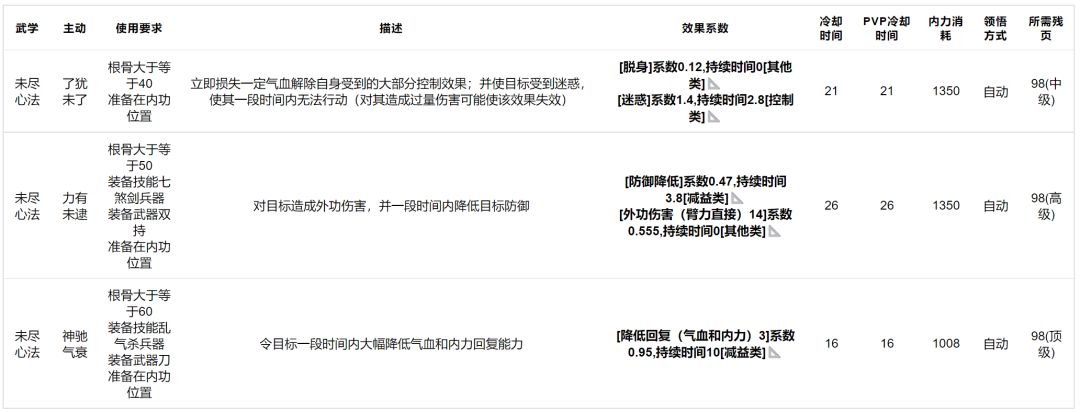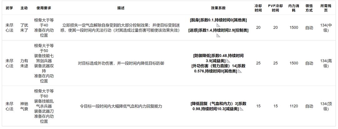 未尽心法:效果如下,三个技能都不算特别有用,脱身的技能要求最少,反而是最有可能上场的,门派内武学主动提升优先级一般。