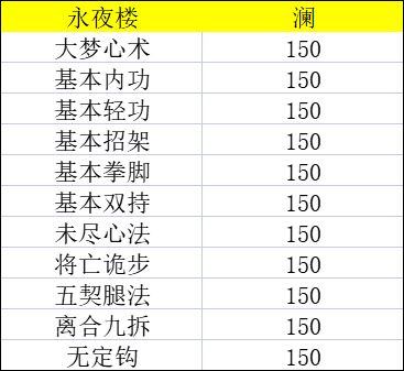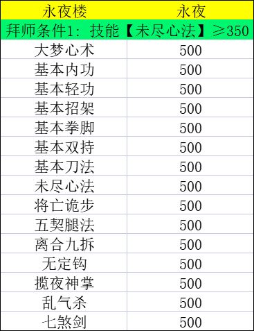 揽夜神掌:永夜楼目前的绝对核心武学,平砍顶级末尾,但技能堪称拳脚最强一列,高级武学。