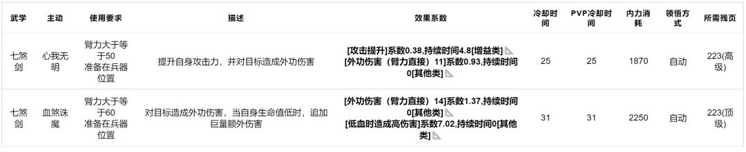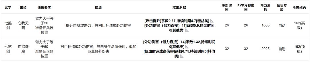 七煞剑:效果如下,技能很强势但缺点也很明显,非残血收益很低,而且平砍较低,不过对比门派内其他武学,还是很好用的,门派内武学主动提升优先级较高。