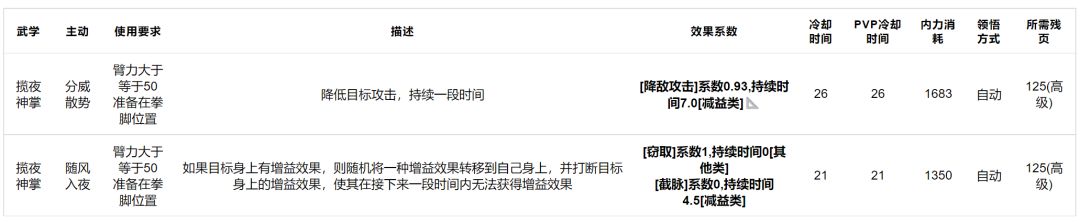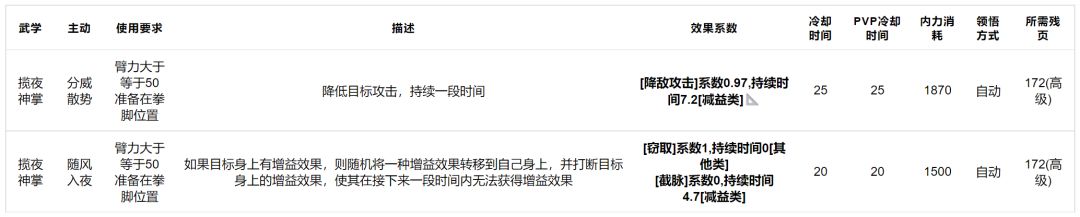 揽夜神掌:效果如下,技能相当顶,无论是持续截脉还是偷取和降攻击,收益都相当高,哪怕放在整个江湖拳脚里也是数一数二的技能,门派内武学主动提升优先级最高。