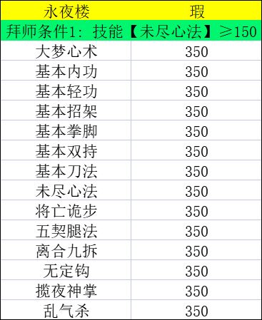 综上:不难看出永夜楼是偏向于拳脚的门派,目前来看拳脚的不绑内给予永夜楼变通的可能性,但兵器和轻内的强度也导致自身门派发挥只能看拳脚,所以喜欢拳脚的玩家可以优先考虑永夜楼。