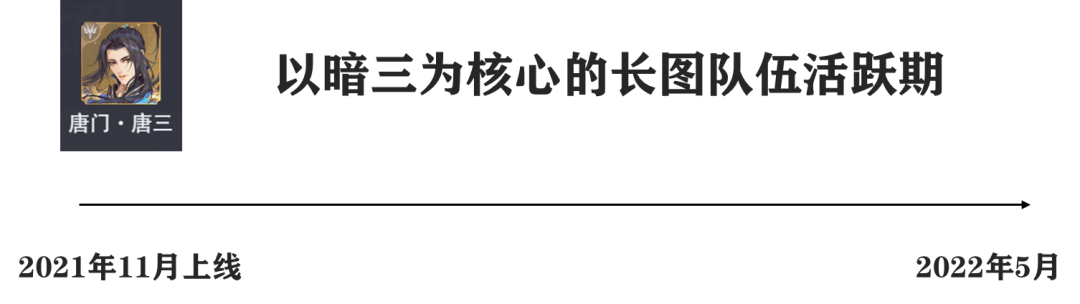 首先如果说到暗三,那么我们可以回溯到去年的11月份,那是唐门唐三的上线也为游戏的长图带来了全新的阵容和玩法,而且这些阵容(包含标准暗器队、小白暗器队、唐晨暗器队等)大致是持续到了2022年的5月左右才慢慢被祝福流给刷了下来,大家可以注意下这里暗三的活跃时间大概持续了6个月的时间。