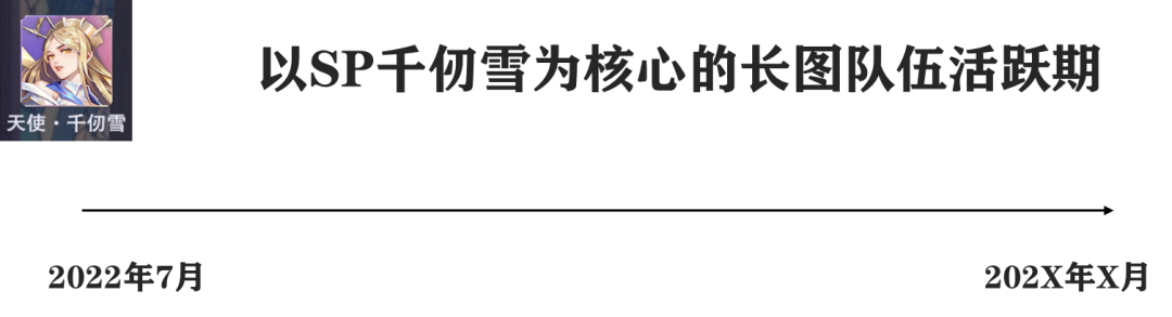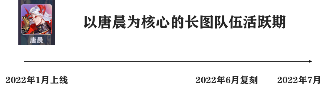 接着我们再看到唐晨,时间回溯到他上线时的2022年1月,自此以唐晨为长图输出核心的队伍(如唐晨暗器队、唐晨祝福队)便一直持续到了2022年7月SP千仞雪上线才慢慢退出了历史舞台。而如果大家注意一下这个持续时间,便会发现好巧不巧大致也是6个月左右。另外大家还需要注意的是,SP唐晨的复刻时间为2022年的6月,当时很多朋友也是闹得如目前波赛西一般热闹,但不料在不到2个月之后,唐晨便渐渐在长图中失了宠。
