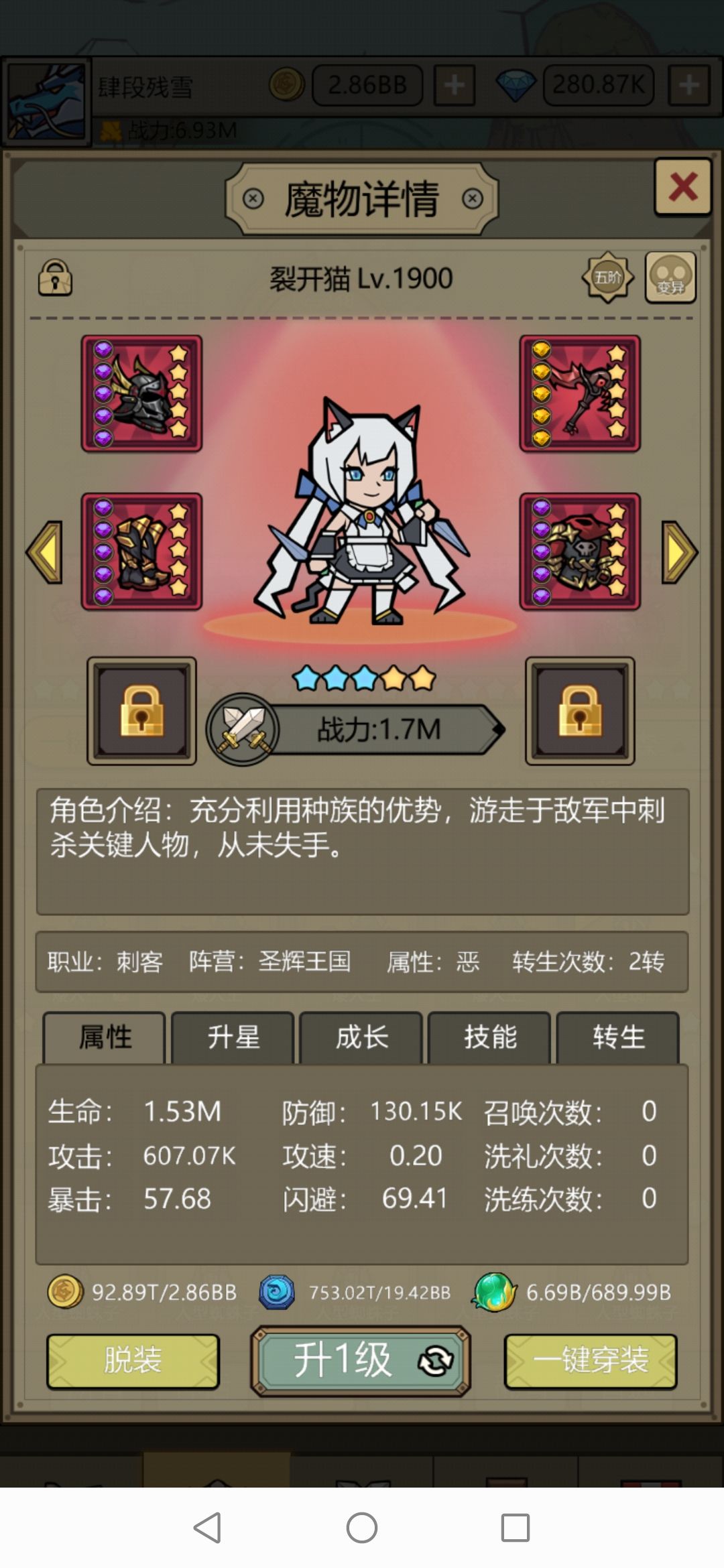 矮人王,人型蜘蛛子,骷髅骑士,魅惑女妖均10星只有1转。裂开猫8星,2转1660未满级,两个专属装备都未解锁。