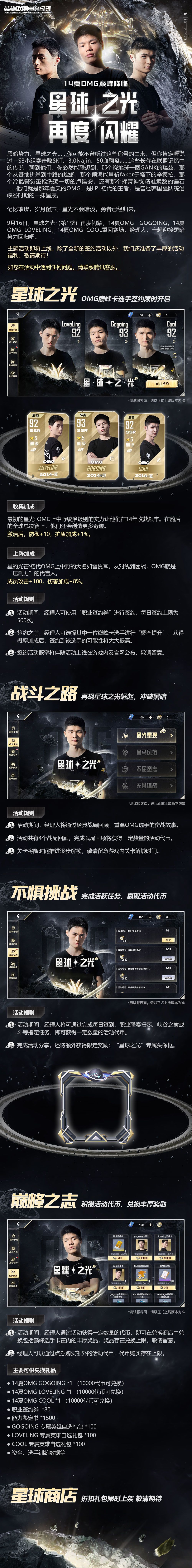 9月16日,星球之光(第1季)再度闪耀,14夏OMG GOGOING,14夏OMG LOVELING,14夏OMG COOL重回赛场,经理人,一起迎接黑暗势力回归吧。