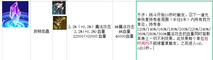 干涉:战斗开始10秒时触发,召下一道光束恢复持有者周围(半径5米)内所有我方单位,持有者120%/140%/160%/180%/200%/220%/240%/260%/280%/300%魔法攻击的血量同时驱散其身上一切不利效果,此效果每个单位短时间内不能被重复触发,之后进入cd,cd10秒。