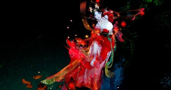 一枝红艳露凝香,云雨巫山枉断肠,缥缈绶带翩扬,黄蝶萦回寻芳。那一抹明媚似火的身影,于浩浩虚空星辰中更为夺目。如烟层叠缎纱璀错缠身,清雅荼白交织烈烈正红,好似正值花期的山茶怒放。腰间墨绿绸锦织配金丝,煌煌圆盘镶以赤宝,垂坠琉璃珠串玎玲作响,奢靡华美。佳人将胭脂涂匀,更施朱粉,道道珠链拂面却无法隐蔽玉颜。她轻抬皓腕,手中海榴之柄光影旎旎,只叹以花结魂之神女落凡,貌惹群芳妒。