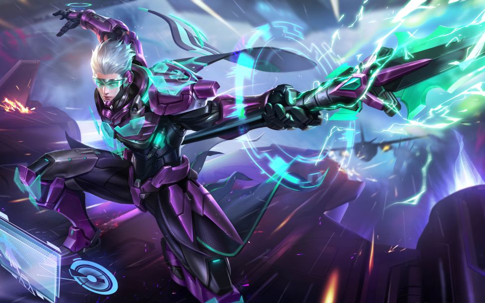 人物配色上使用了更加深邃幽远的深紫色,搭配绿色的能量光效,带来焕然一新的视觉感受。发型也变为更加干净利落的短发,同时佩戴有护目镜,可以在战斗中更加得心应手。