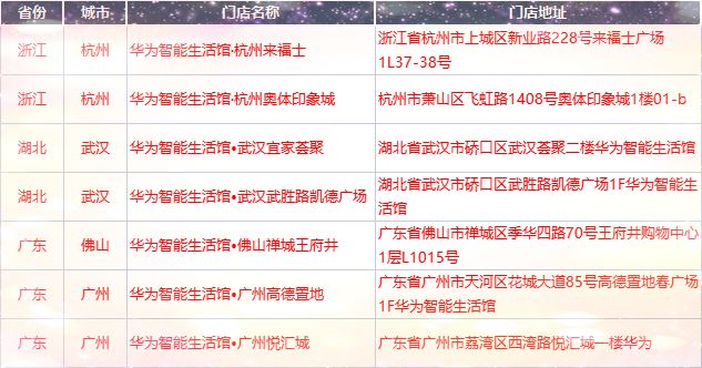 此次华为智能生活馆线下计时挑战赛包含了浙江、湖北、广东三省在内的多家华为智能生活馆,车友们只需在活动时间内前往指定华为智能生活馆即可参与活动。对了~宝宝温馨提示车友们,线下华为智能生活馆分为主题华为智能生活馆和辐射华为智能生活馆,前往主题华为智能生活馆参与活动才有机会获取实物奖励哦~详细地址请看下表: