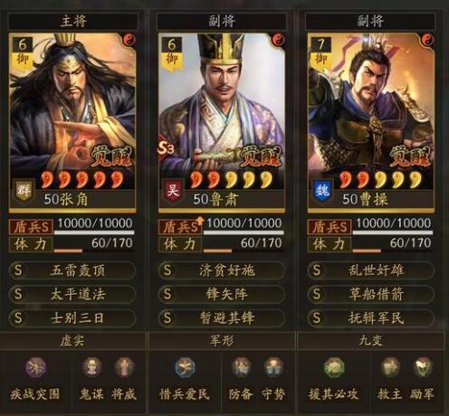 强度点评——满红张角搭配鲁肃和曹操,还给鲁肃安排了盾兵宝物,可以说强度完全拉满,对于一些没有抽到刘备或者感觉带刘备伤害不够的玩家来说,这套阵容无论是输出续航还是抗性方面都是相当给力的,红度给力有天公援助甲可直接安排。