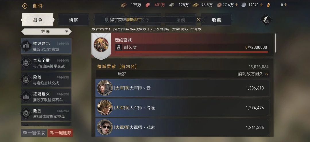 在宣战前夕【大军师】与【种地盟】,就派出投石车隔墙清理城内建筑,晚上十点半宣战结束后【大军师】联盟军团从西城门攻破定约宫城。清理首领、进攻主城到最后的拆迁共用时15分钟,虽然战损比很高,但一鼓作气拿下九级城还是十分振奋人心的!