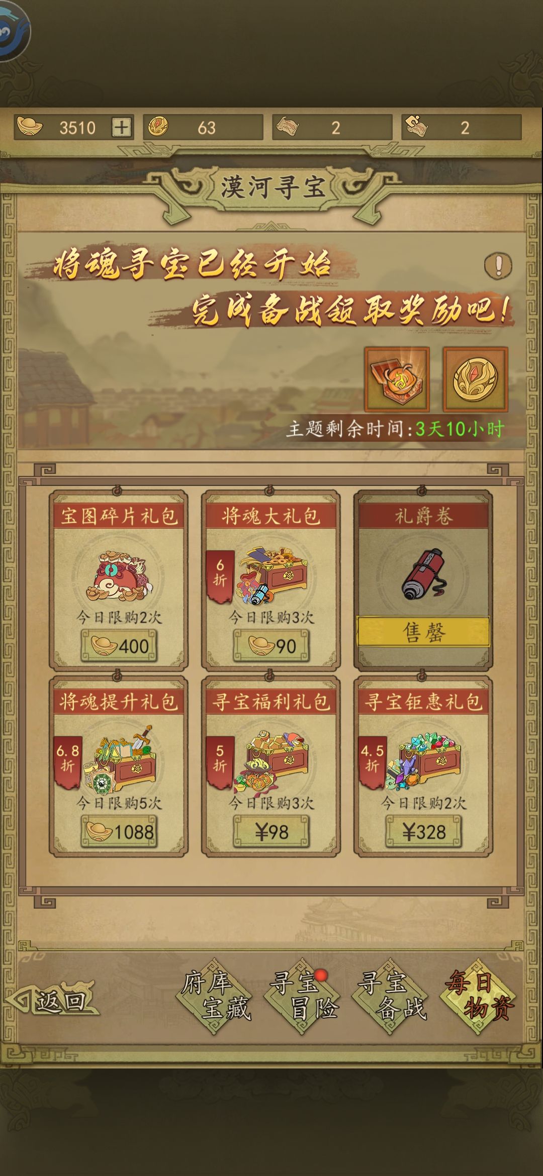 一个比较晚的活动,但同样是法宝的主要来源,所以拿下没商量,但是宝物强化礼包和培养礼包可以根据自身需要来选择,毕竟这个不给奖章。