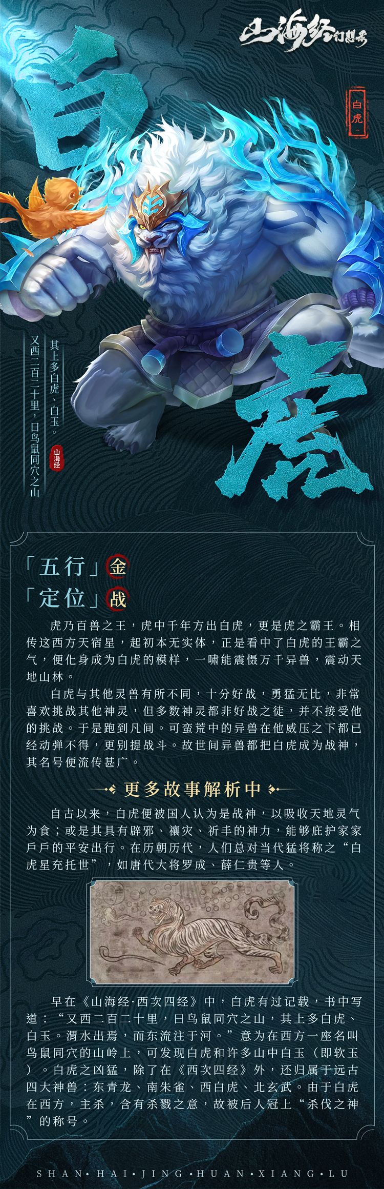 彼时盘古混沌之中开天辟地,四象星宿化为神灵助其创世,白虎正是四象之一,西方之星宿,拥有天星之力,于四季为秋,于五行主金,掌控世间天气。