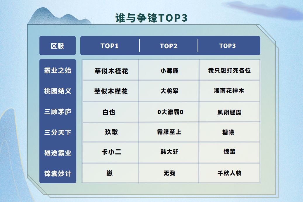 以上18位将军叱咤各区服“谁与争锋”榜单前三名,每一次竞技都是操作的比拼,如果碰巧你也在看这个文章,不知道方不方便在评论区聊聊竞技大法(老曹OS:将军们起名的思路确实都很有自己的风格,难道这就是制胜的秘诀吗?)