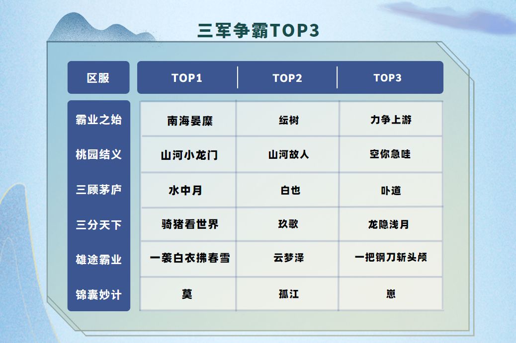 再强大的对手也阻挡不了将军们闯关的脚步,以上18位将军叱咤各区服“三军争霸”榜单前三名,相信能在三军争霸夺得榜首除了诸君的实力外,团队实力也不容小觑!