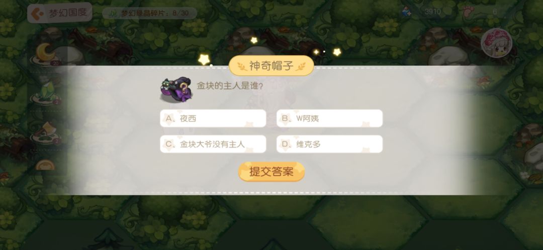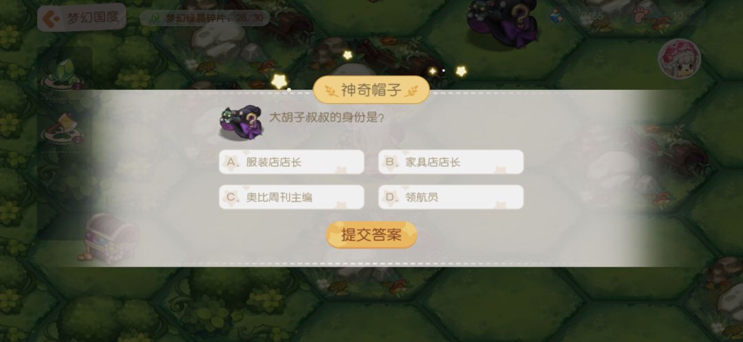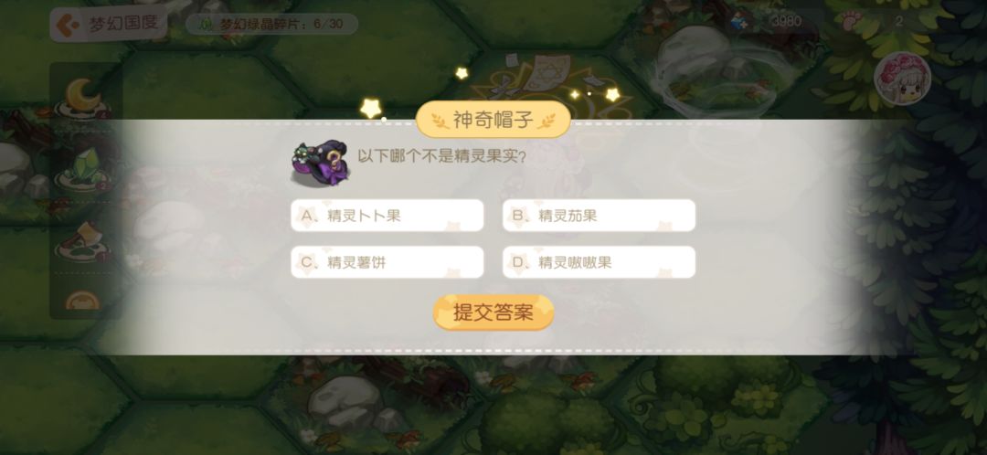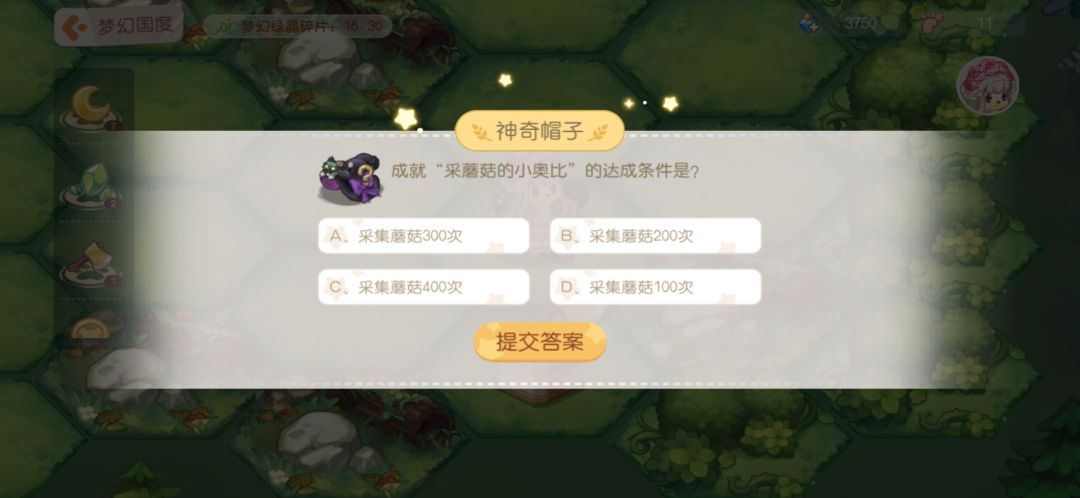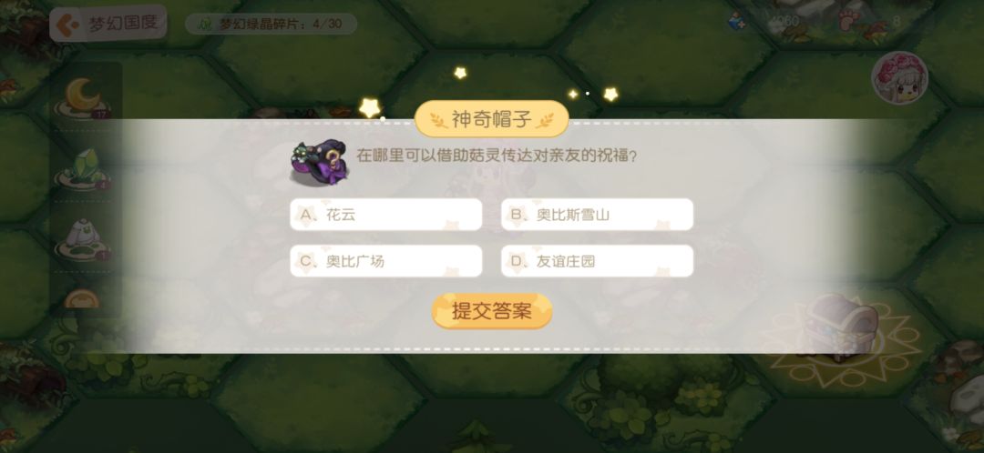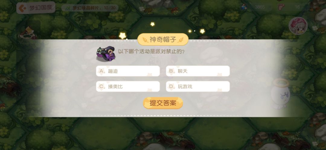 11.神奇帽子:答题,答对之后给步数和月亮结晶。下面是我见到的题目,不一定全但是遇见的我都截图了,题目挺简单,大家简单看看就能记住答案。