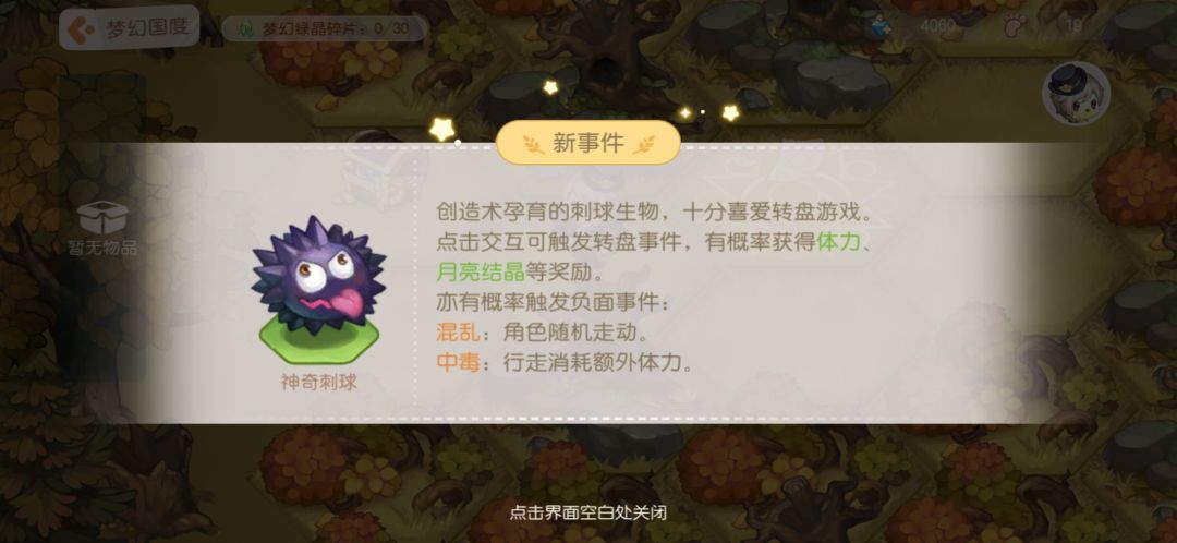 6.神奇刺球:抽奖,三分之一的概率获得月亮结晶和步数,三分之一下次走路不受控制,三分之一中毒接下来几步消耗双倍步数。我个人认为能踩就踩,毕竟有概率获得月亮结晶,至于debuff混乱和中毒,我们怎么都要买一次体力,就算踩到debuff也基本是够用的。