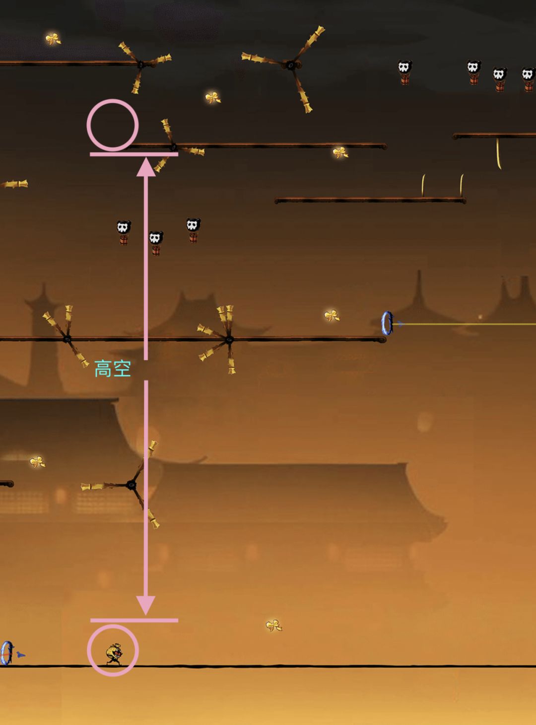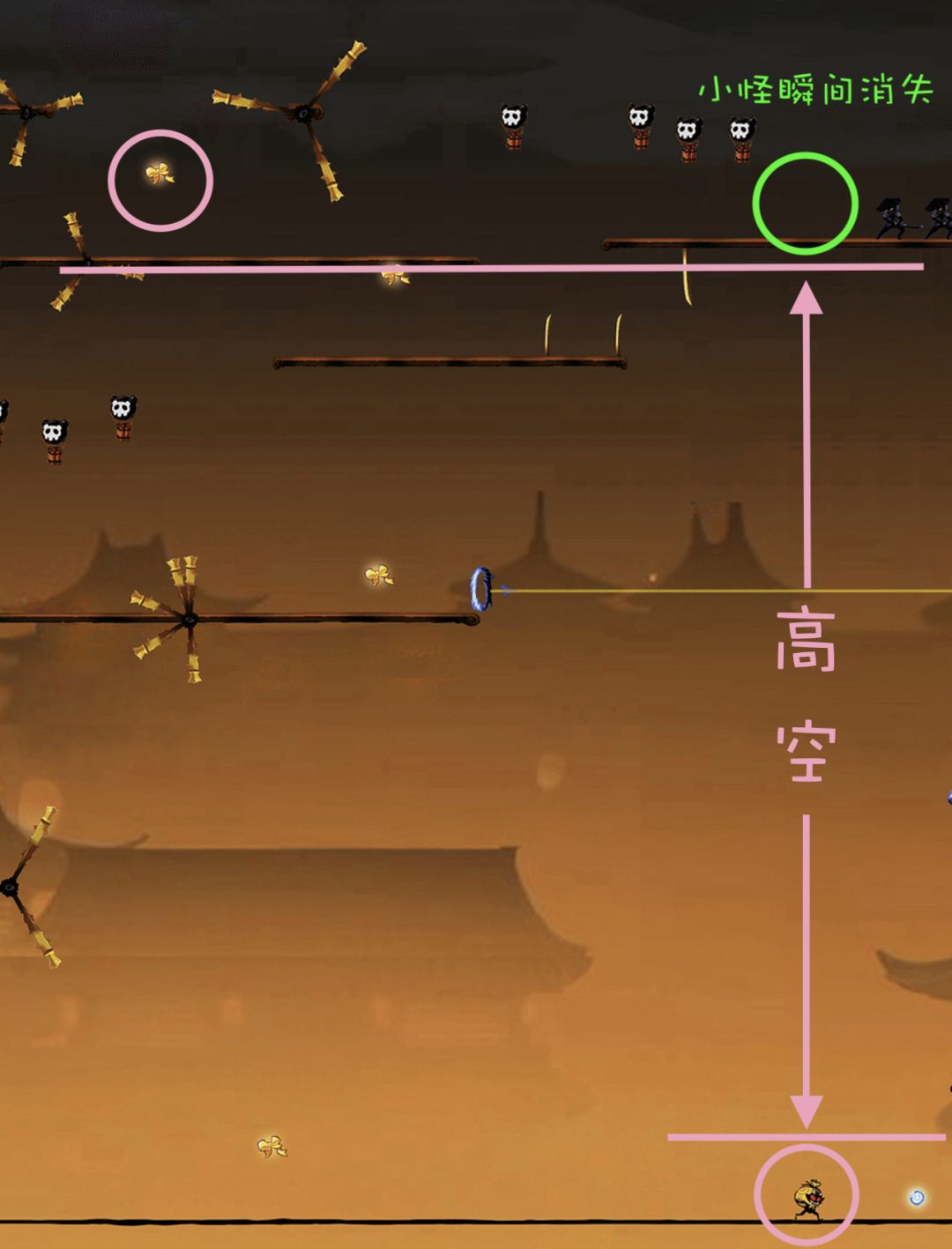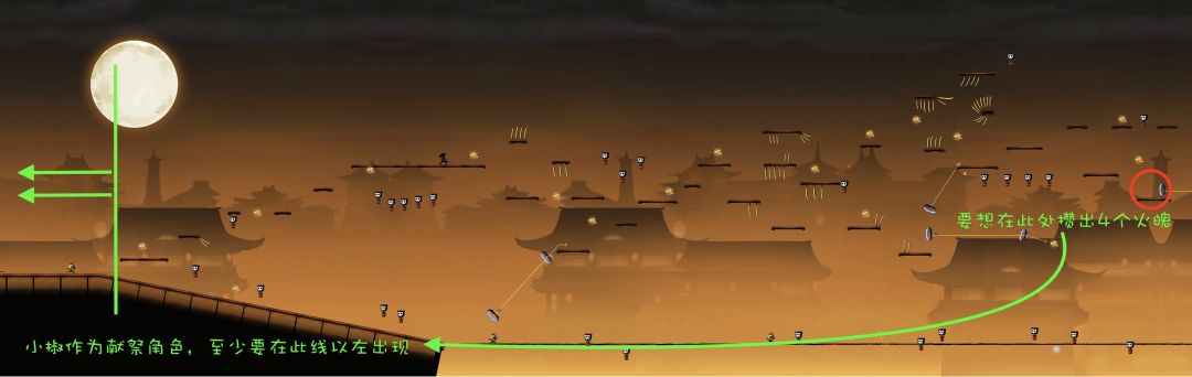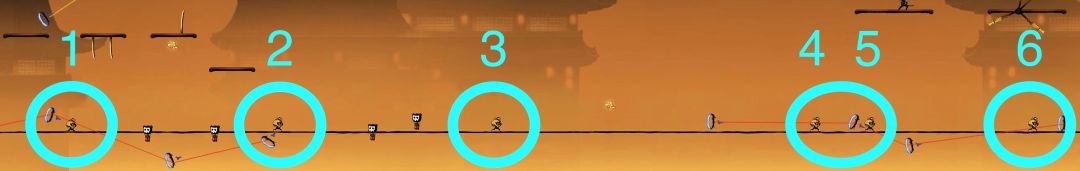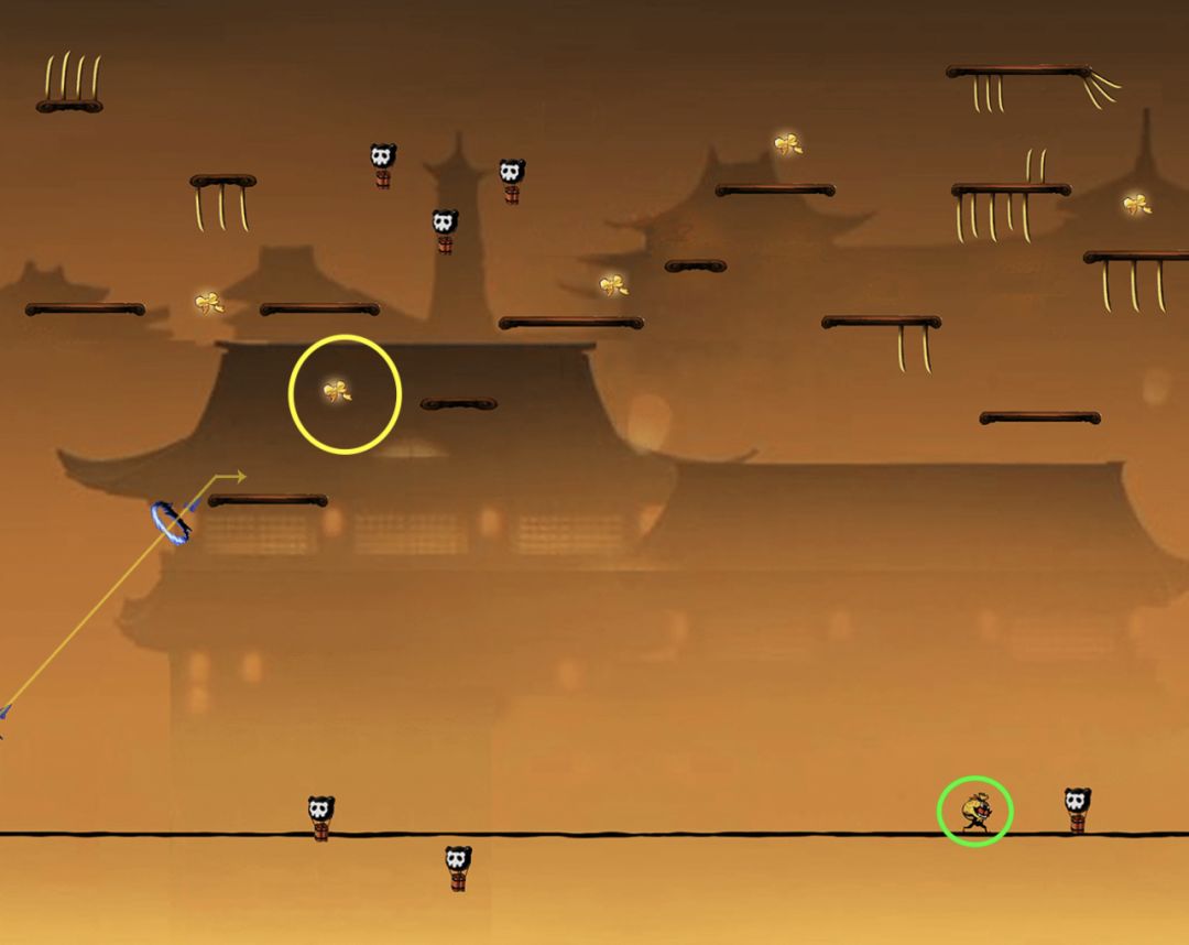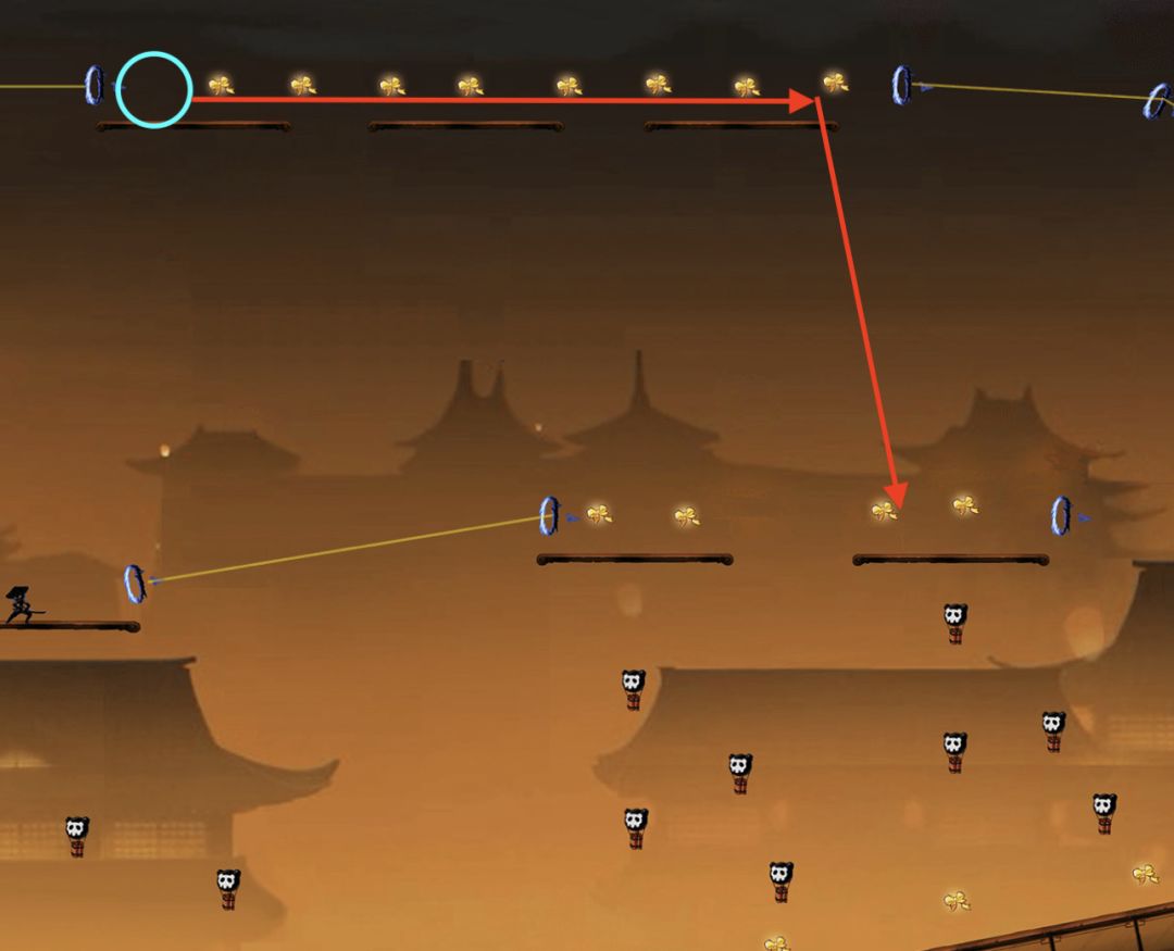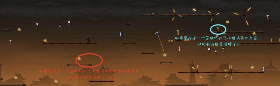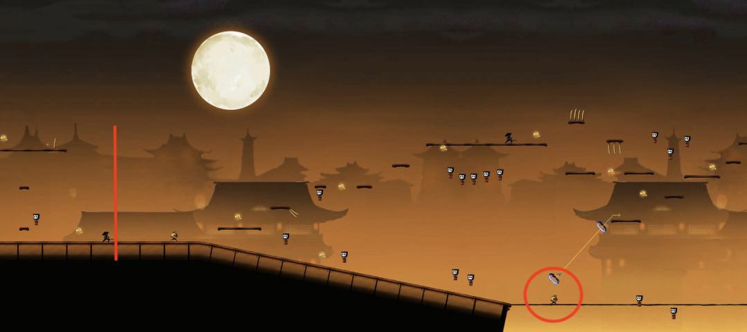 对于绳子上的小怪,如果忍者在小怪生成位点左侧很远处,即此时小怪还没有出现。若忍者处于高空状态,即忍者所处的水平线与绳子的距离非常大时,如下图:
