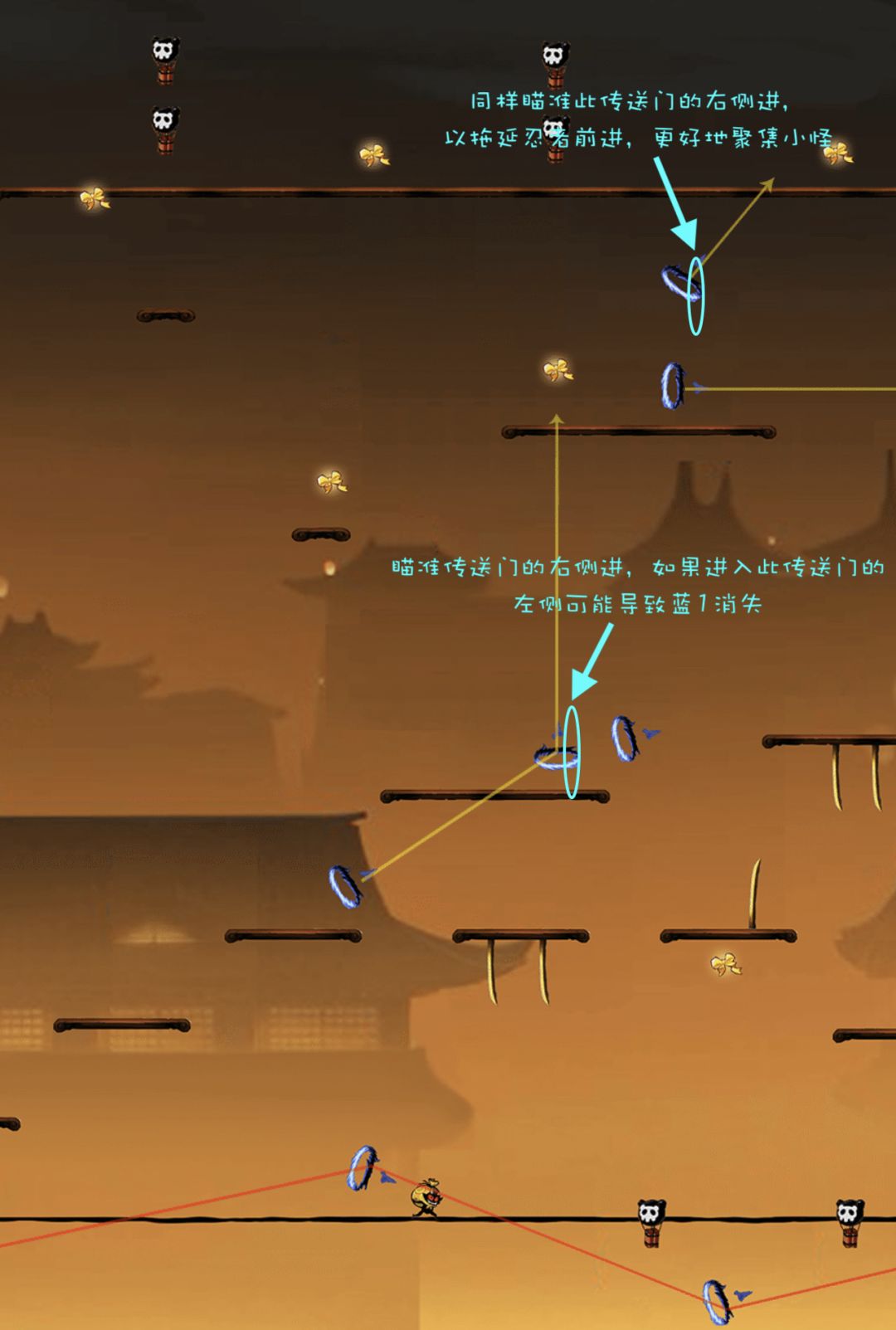 上图是常规椒牙82跑法中所走的两条路线,红蓝二选一。可以看到,第一张图相比于第二张图所走的路线,显然是要多吃了一个礼带。