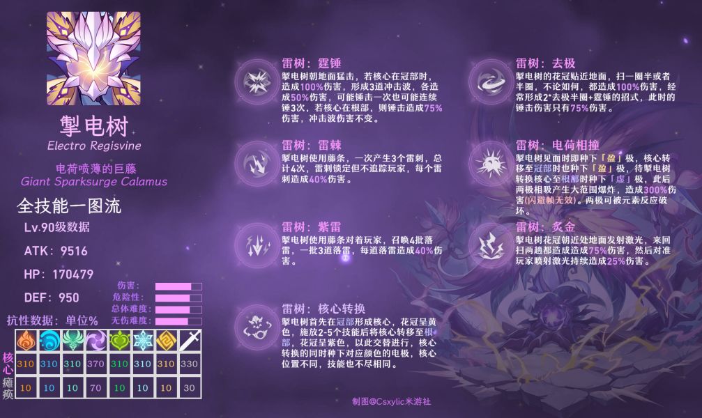 从树冠中源源不断释放出电力,如同发泄着大地的愤怒。曾经有妙论派的学者提出,如果围绕掣电树建立起一套复杂的电路矩阵,便能够将其中的电能输送到城市里使用。这一计划遭到了素论派学者的激烈反对,为此他们不惜牺牲了十头蕈猪以证明使用电力的危险性。#以上摘自讨伐手册&据说是雷骗骗花长大变成的的东西~,而且比原来的冰火树难一些,平均伤害也会高一些。