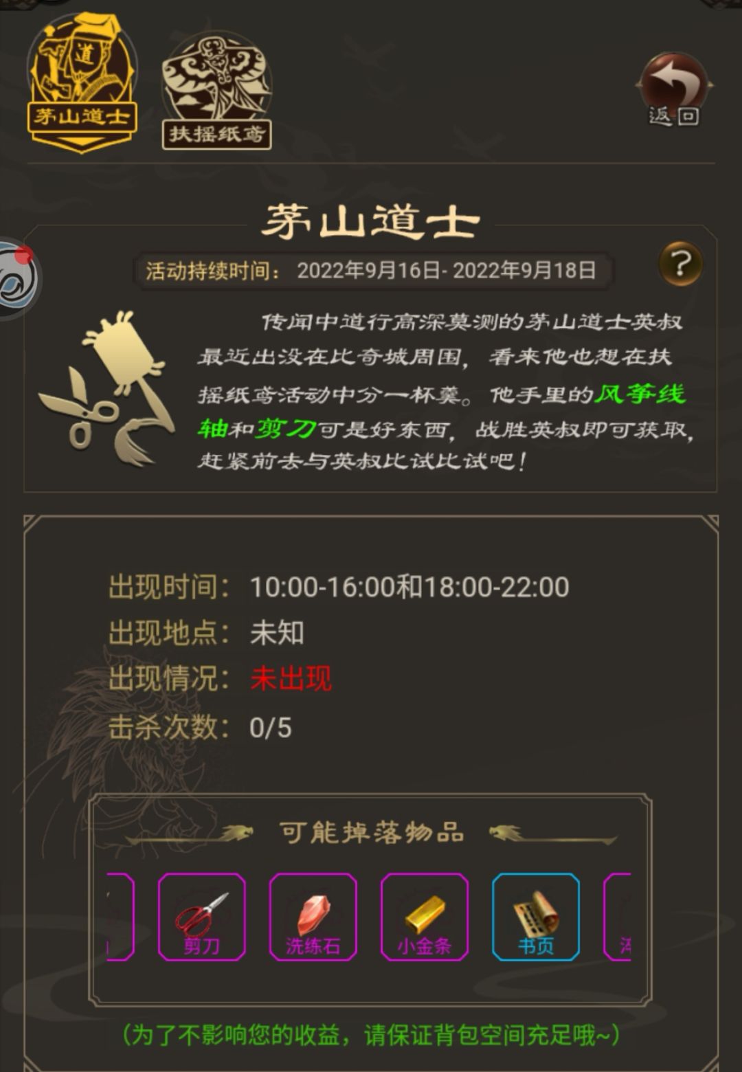 纸鸢活动持续三天,在每天的10点开始随机在一个低级地图刷新茅山道士,可以击杀五次,会随机掉落风筝线和剪刀,一般情况下,风筝线和剪刀每样至少五个,如果没有的话,你要考虑是不是要去扶老奶奶过马路了。