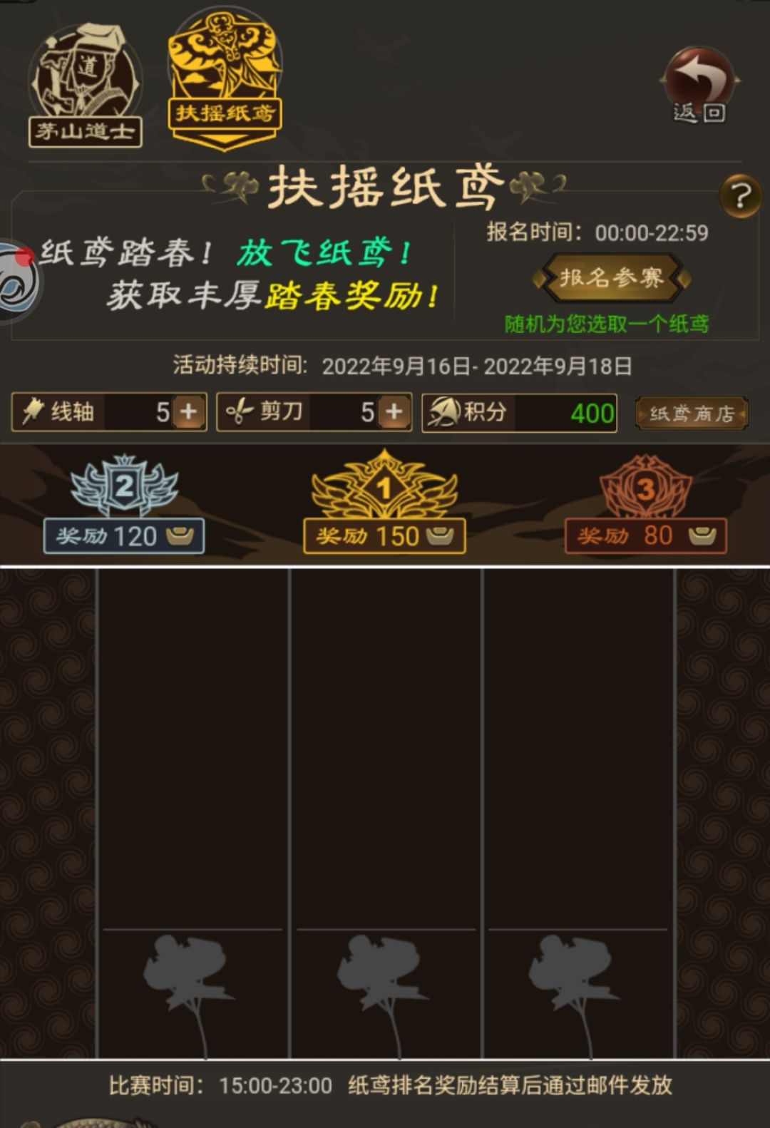 到下午三点的时候,就正式开启比赛了,在晚上十一点前都可以报名,共三个队伍,随机分配到一个队伍,对自己队伍的纸鸢使用风筝线,可以使纸鸢上升10米,同时加积分100,对别的队伍使用剪刀,可以使别的队伍纸鸢下降10米,同时加积分100,积分的作用后面再说。二十三时比赛结束后,按照纸鸢高度排名,第一名的队伍获得150元宝,第二名120元宝,第三名80元宝。