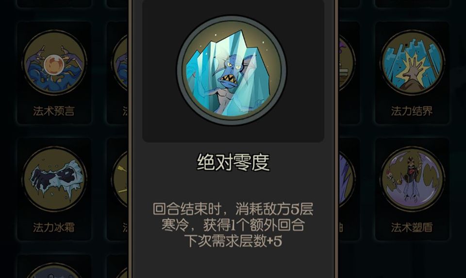 就比如“坐牢冰法”,套路核心是学会祝福技能“绝对零度”,该祝福效果为:当你回合结束时,寒冷值达到一定层数,就能直接冻住BOSS,跳过它的回合。因此,你可以全拿冰冻系法术和回复过牌,直接让BOSS变成单方面坐牢,伤害低也不担心,一点点磨死BOSS。