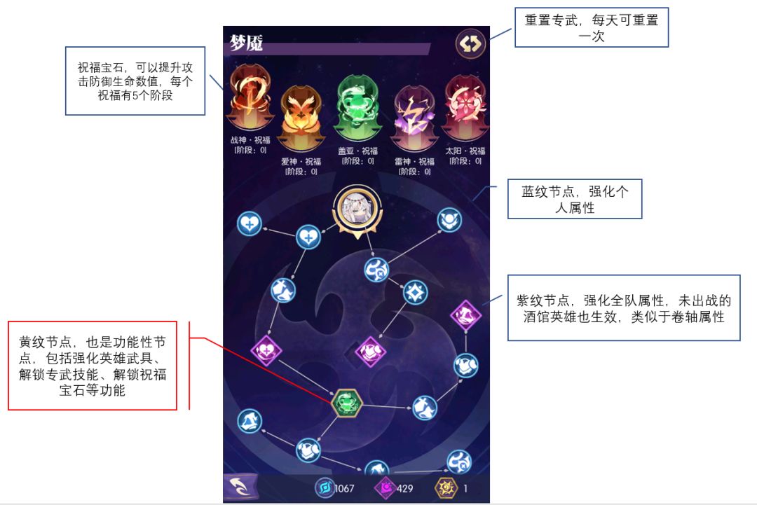 ①芙蕾雅龙刀先点满主角底座(一共需要16个黄纹),之后点满芙蕾雅,然后其他人点到爱神前最后一个紫色节点,之后单拉一名恒金英雄