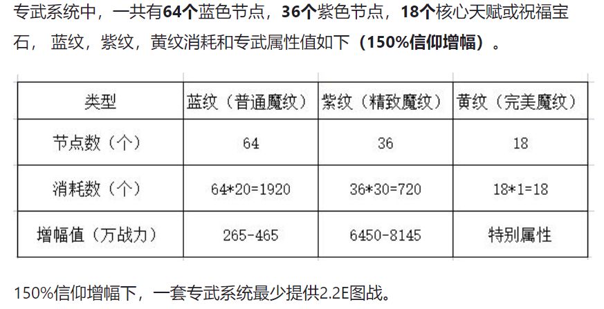 |升级专武分别要三种材料:普通魔纹(蓝纹),精致魔纹(紫纹),完美魔纹(黄纹),每一个节点对应需要消耗蓝色30魔纹,紫色20魔纹,黄色1个魔纹,所有英雄的节点数量一致
