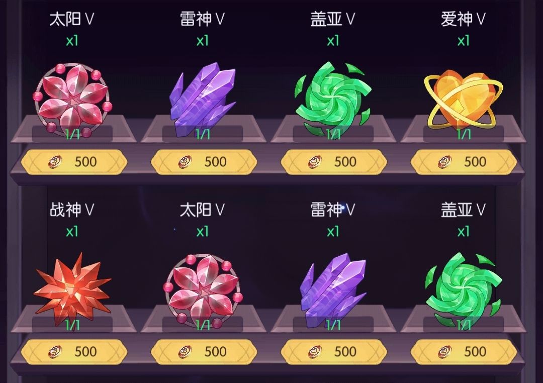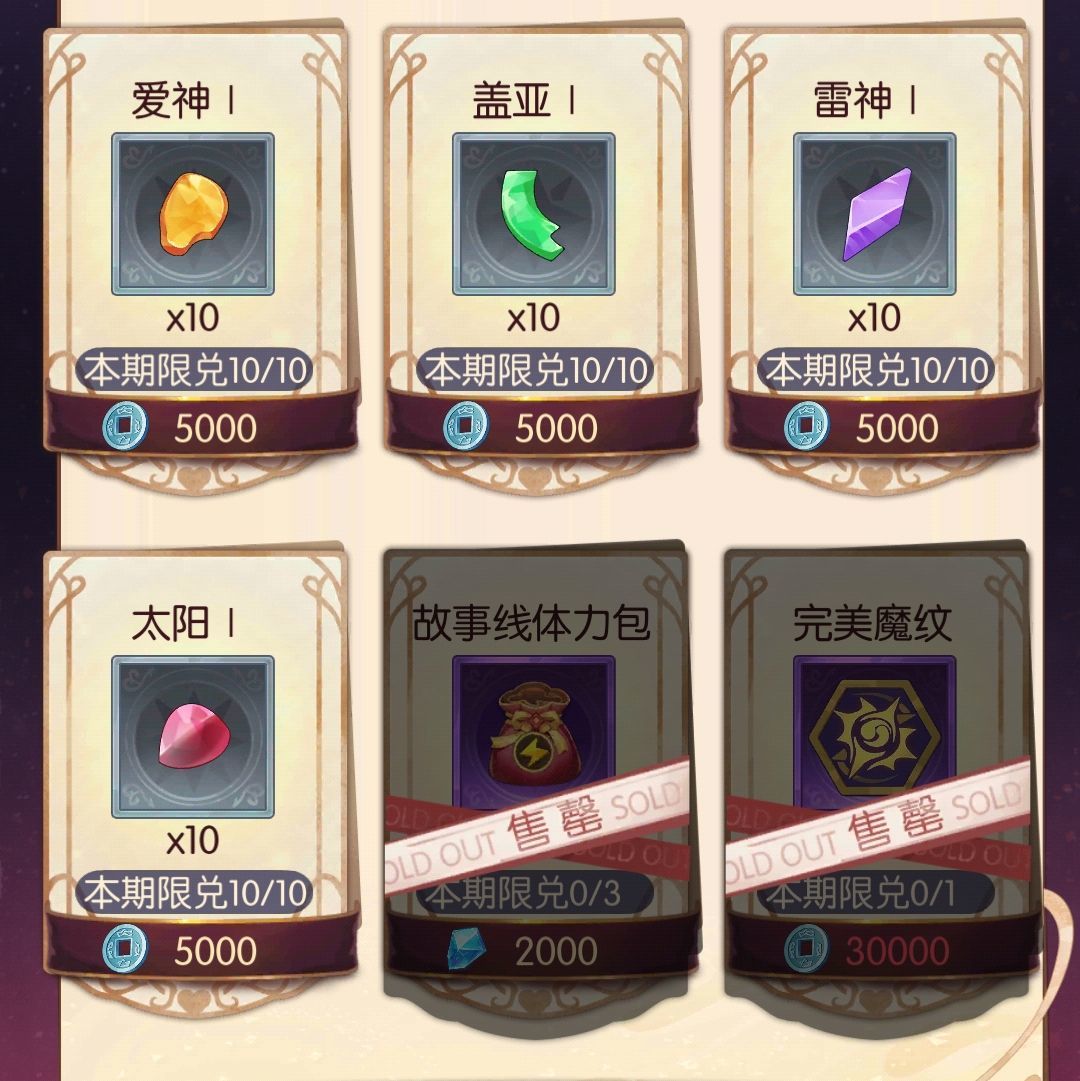 ②玫瑰金商店500一个,如果玫瑰金有多余或者不准备买传家宝以及活动礼包的话可以买,其中购买优先级为:太阳>爱神>战神>雷神>盖亚,太阳和爱神提供的战力是其他碎片2倍左右,大概2.5亿(300%信仰+满专武),可以选择买空太阳后再买空爱神,以此类推